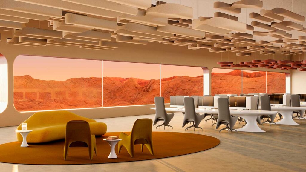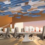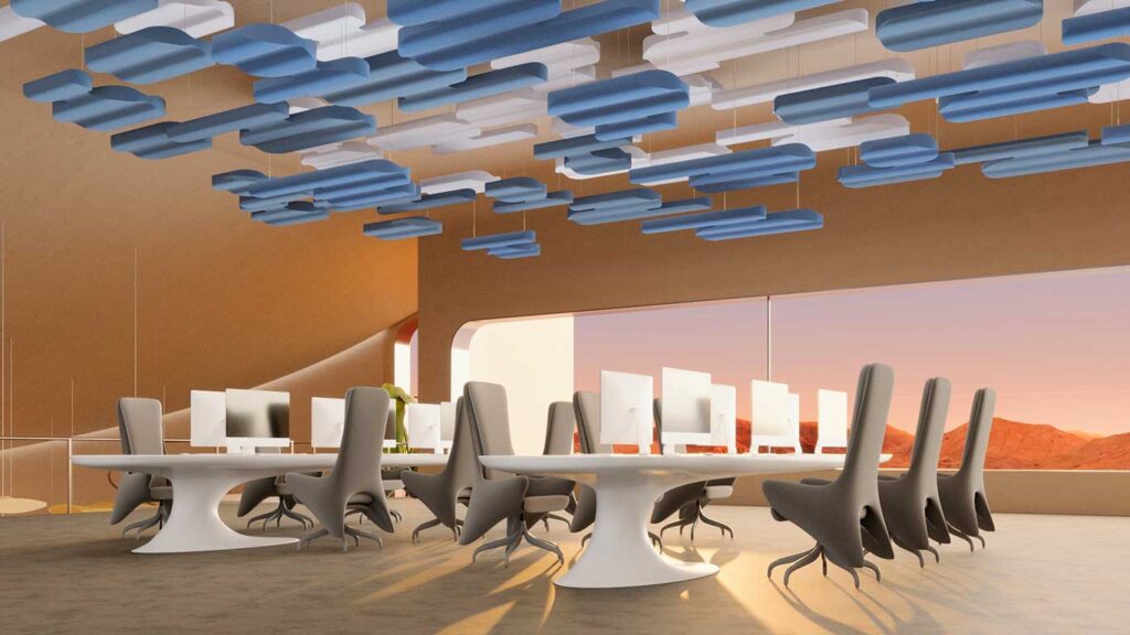 A nuvem acústica Nébula pode ser usada em lobbies de prédios e espaços corporativos, entre muitos outros ambientes.